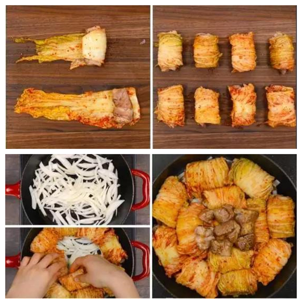 2、用辣白菜将排骨卷起(不吃辣的朋友可以用普通白菜替代),放在铺满洋葱丝的锅中,上面再放上一些排骨。