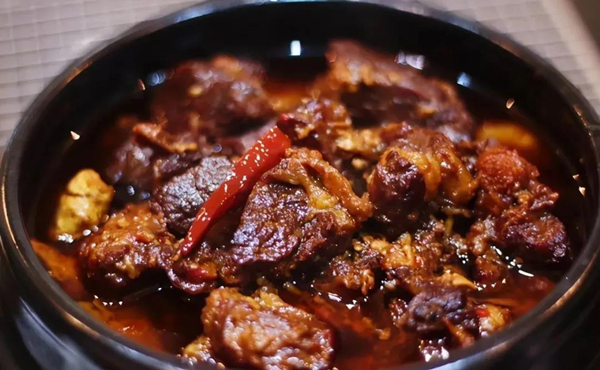 炒的差不多时,加入一些料酒和冰糖,料酒去腥软化牛肉,冰糖使牛肉更加鲜亮。牛肉充分吸收调料味道时,加入适量的开水,注意加开水。