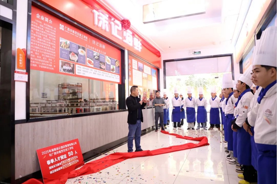此次产教融合教室揭牌仪式圆满举行标志着广西华南烹饪技工学校与企业合作的深化,旨在提升人才培养质量,为学生实习就业开辟新路径,促进教育与产业共同发展。