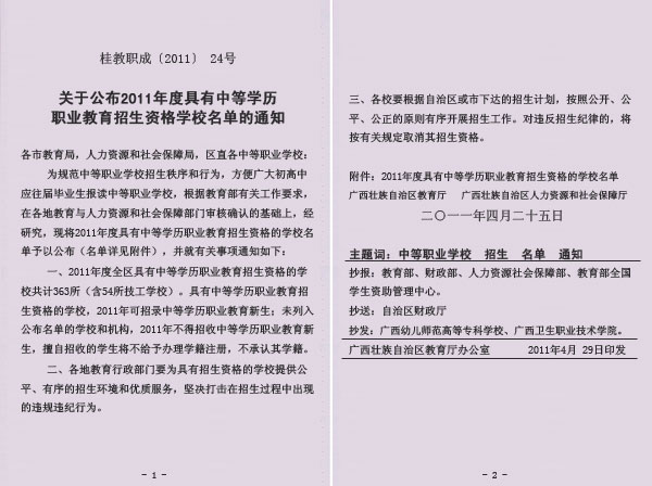 根据区教育厅、区人力资源与社会保障厅下发的《桂教职成〔2011〕24号》通知精神,我广西华南职业技能培训学校完全具备中等学历职业教育招生资格,并成为区直学校中唯一具备该资格的民办学校,报读我校的学生,毕业时将获得区教育厅颁发的毕业证书。