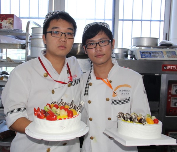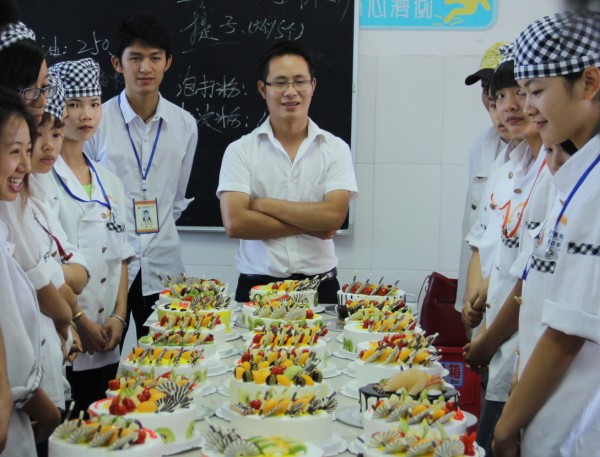 10月11日上午,广西华南烹饪学校西点四班的同学们带着努力学习的成果在教室里也摆出了自己的展台,向学校领导和老师们成功展示了自己在学校努力学习成果。西点行业热,也促发了学习西点的热潮,在广西华南烹饪学校西点教室现场,一群学习西点制作的俊男靓女们,他们用自己的妙手,把水果、巧克力、奶油等原料巧妙融合,一个个精美的蛋糕在转盘上诞生。