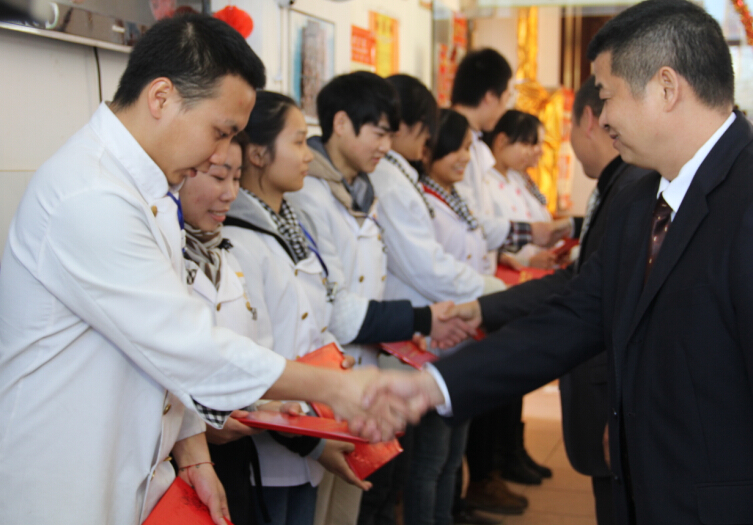 华南新春“百家宴”在欢乐祥和的气氛中进行的同时,广西华南烹饪学校“百家宴”暨优秀学生表彰颁发荣誉证书发放仪式在大学路校区、明秀校区同时举行,在颁奖仪式上,校区负责人朱伟主任在对获奖学员表示祝贺的同时,他鼓励获奖学员继续努力,并要求其它学员要像获奖学员学习,加倍努力,争取下次取得好成绩。随后朱伟等校领导为获奖学员颁奖。