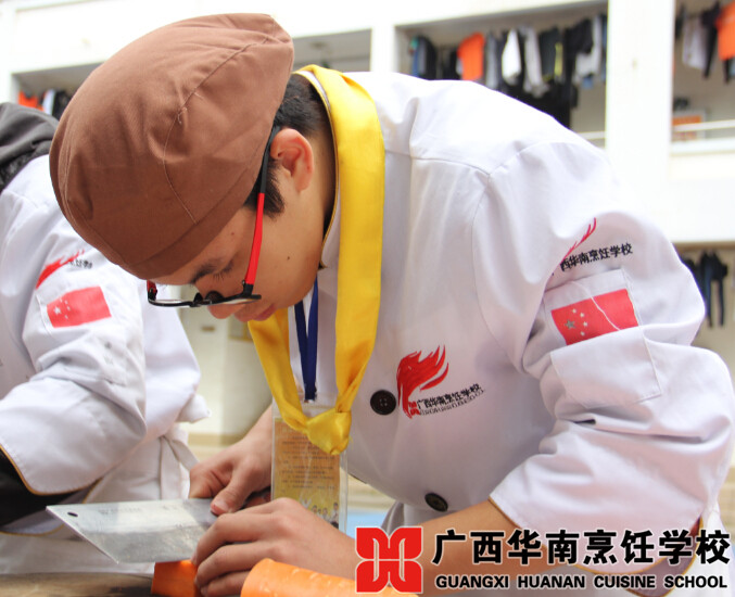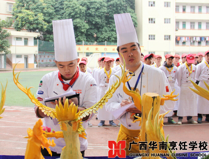 近日,广西华南烹饪学校的操场上,一条近五十米的“美食长廊”吸引了众多学子围观,成为校园里的一道风景线。走进一看,原来是同学们热菜、凉菜、刀工、雕刻阶段考核的作品展。