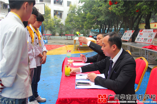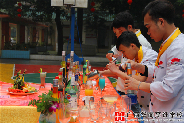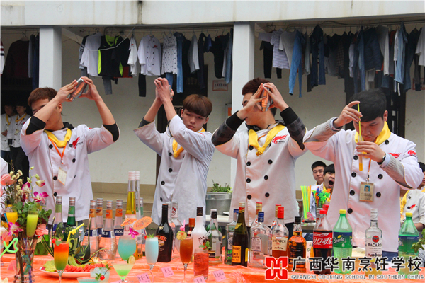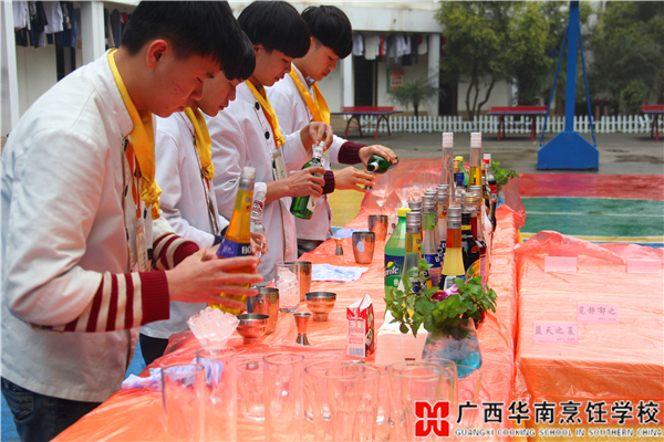 3月18日上午,在广西华南烹饪学校的篮球场上聚集了一群精神抖擞的华南学子,他们正自信满满地迎接新一轮的调酒阶段性考核。