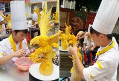为了全面掌握和了解学员在各阶段学习情况,近日,广西华南烹饪学校明秀校区操场上进行了一场雕刻大比拼。 现场同学们认真的雕刻作品 这次雕刻考试要求每位学员用南瓜在2个小时之内自由雕刻创意作品。据了解食品雕刻