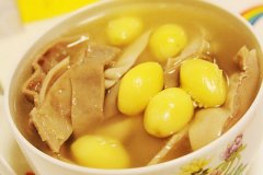 主料:白果150g 猪肚380g 辅料:黑胡椒适量 鸡粉适量 清水适量 白果猪肚汤的做法步骤: 1、处理好的猪肚和白果。 2、将猪肚和白果放入煮锅中,倒入适量的清水。 3、倒入适量的黑胡椒粉。 4、盖锅盖,大火煮滚,再煮5分