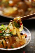 材料: 粉皮,葱,姜蒜,生抽,老抽,花椒,辣椒,香菜。 步骤: 1、粉皮热水泡至7-8分钟后放入冷水,备用。 2、将葱、姜、蒜、花椒、辣椒切碎,香菜切好,备用。 3、在锅内稍微多放点油,放花椒爆香,姜蒜炒香。 4